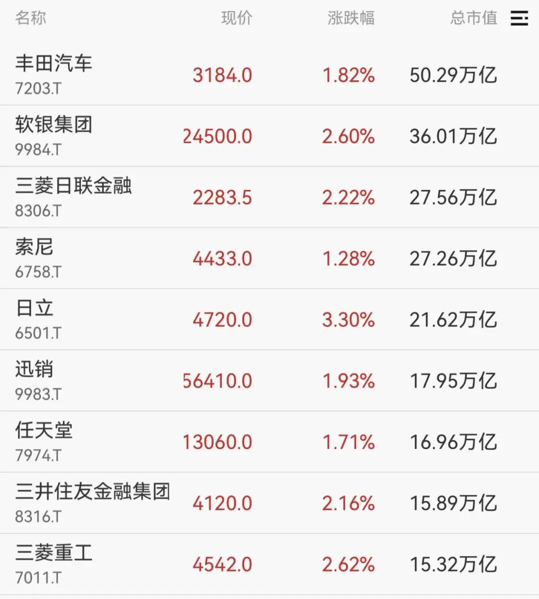 权重股纷纷走强,软银集团、三菱日联金融、日立等均涨超2%。