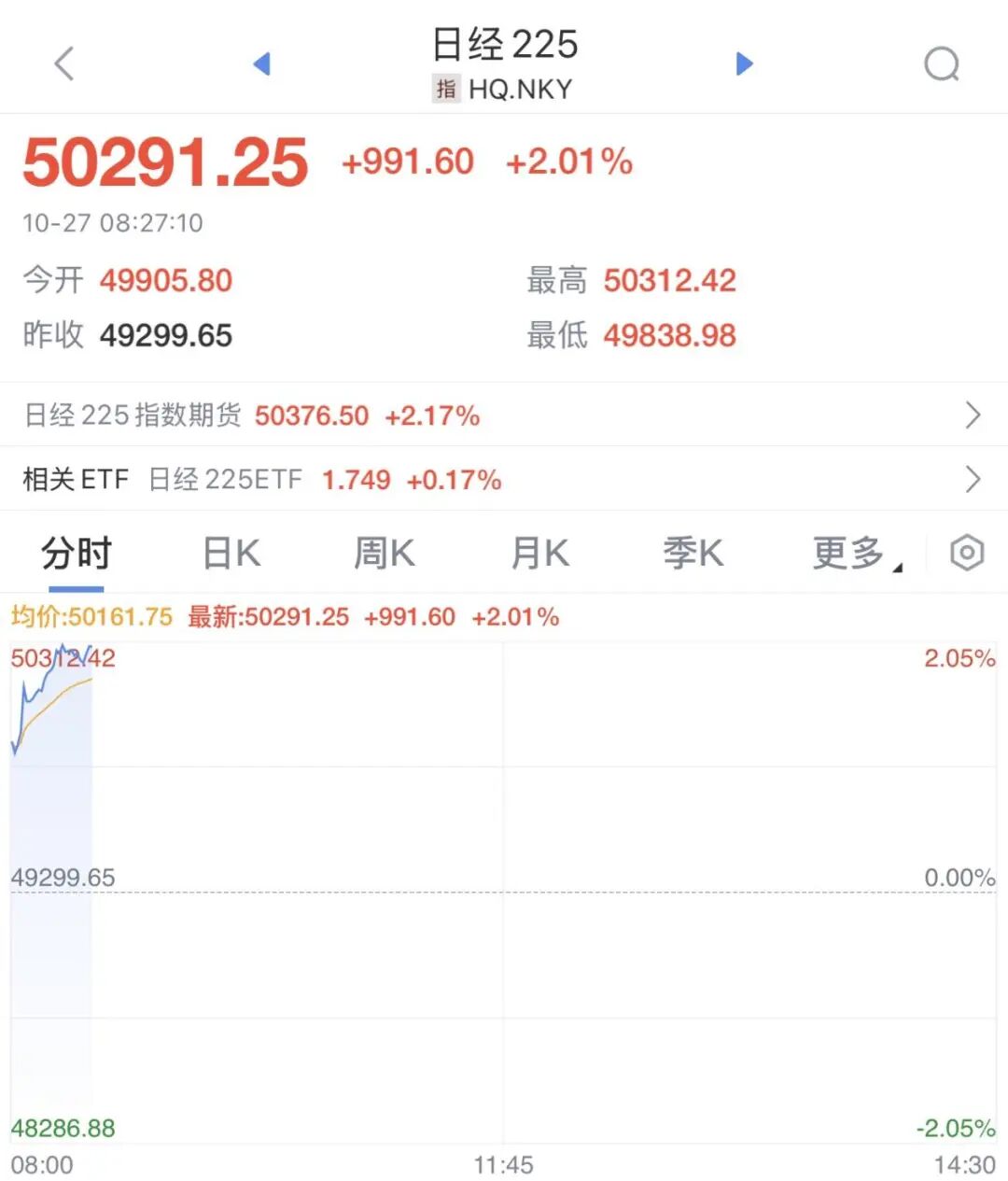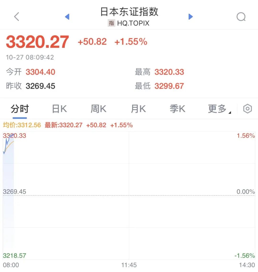 10月27日,日韩股市开盘大涨,日经225指数首次突破50000点,涨超2%。