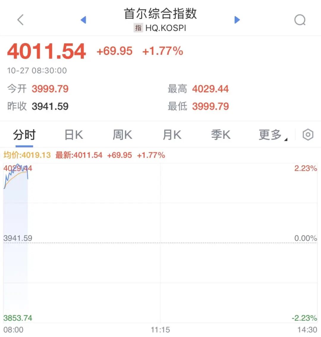 此外,韩国KOSPI指数一度涨超2%,首次突破4000点大关,刷新历史纪录。